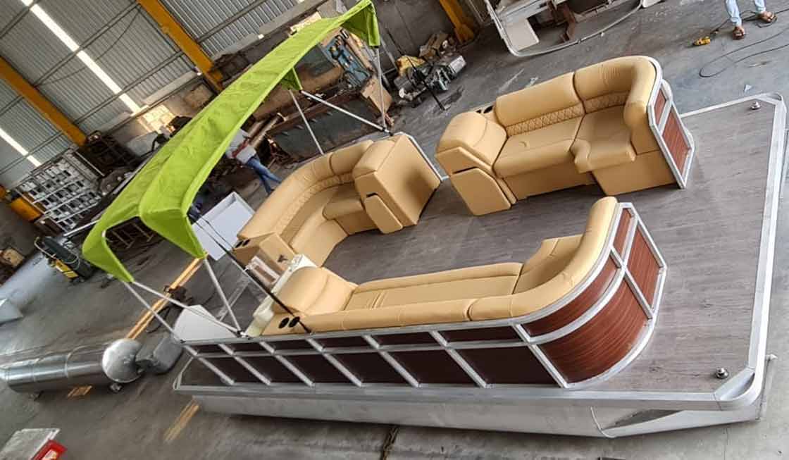 The Pontoon boat is equipped with following features:1. It has twin pontoons of 20’ Length and diameter of 0.63m. The Pontoons are made of Marine Grade 5052