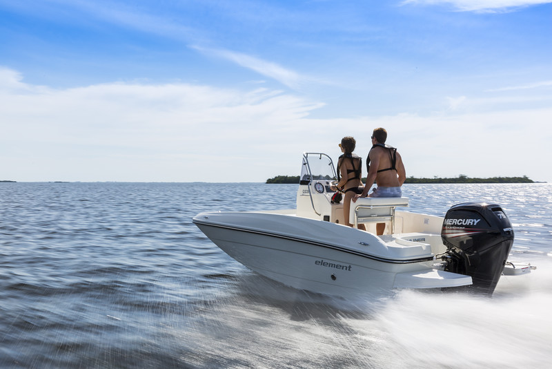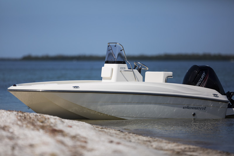 The Element CC5 joins its larger sister, the CC6, as the second in our new series of self-bailing, center console designs aimed at coastal cruising and other day boat activities. Its clean, open layout and roomy bow section considerably expands the capacity of the bow area including an anchor locker, and two, large bow storage lockers. The whole section is covered by a large bow cushion/sunpad making an ideal lounging area. The boat’s aft section features a leaning post at the helm station, plus twin jump seats flanking a roomy lined storage compartment ideal for snorkeling gear or other provisions. Dual swim platform extensions make boarding from the water easier. Our optional F5 Fishing Package converts the CC5 to a great bay fishing boat making this one as versatile as it is affordable.