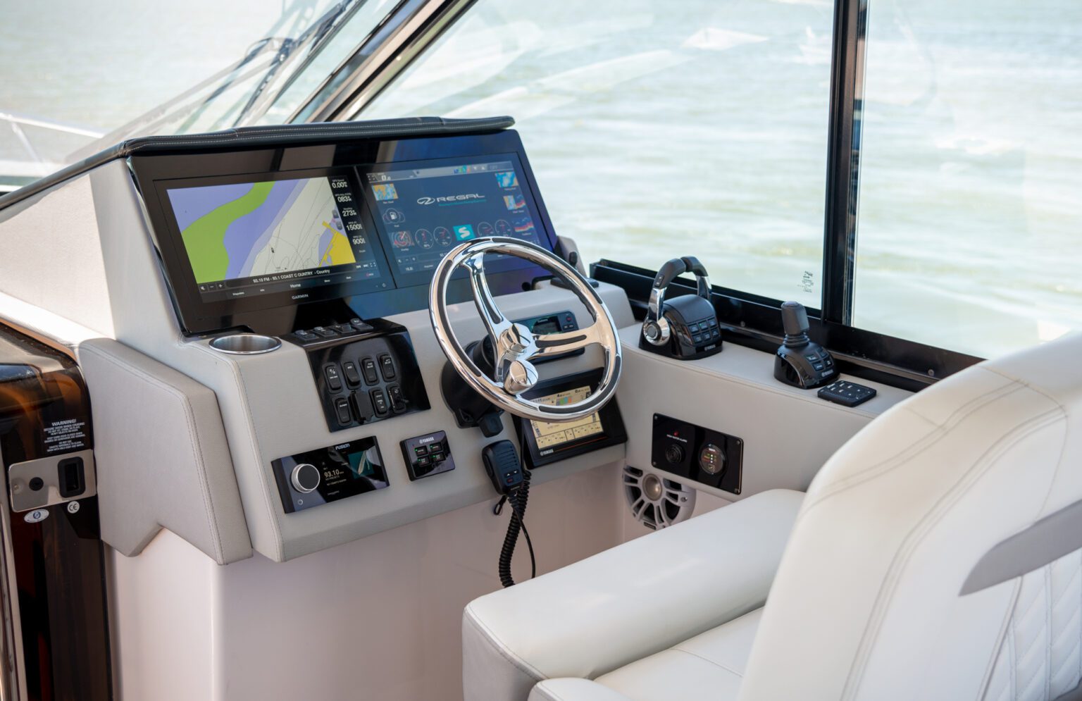 All of the controls, including a single Garmin 22" display or dual 16” Garmin displays with Helm Master EX, Autopilot, and Joystick, are at your fingertips. If you are looking for a bit more climate and audio control add the sliding glass enclosure doors.