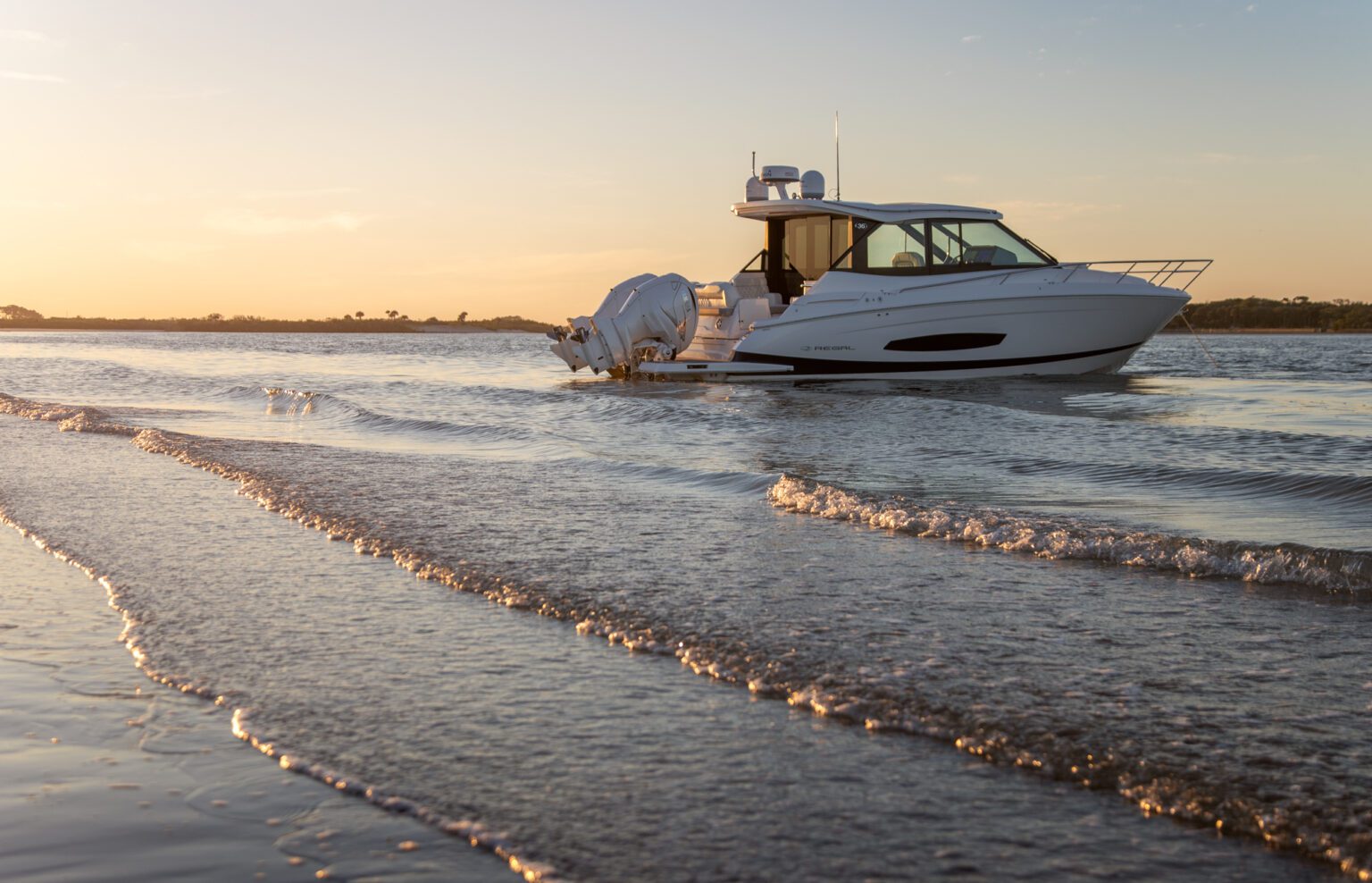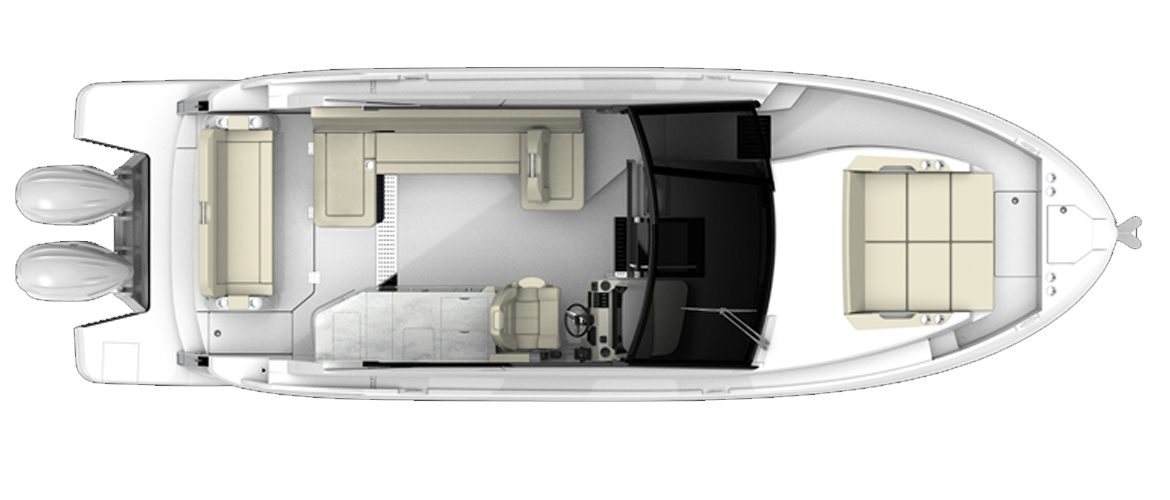 A spacious swim platform is low to the water and features large wings that wrap around the outboards. Start your mornings early with the accent and underwater lighting illuminating your path.