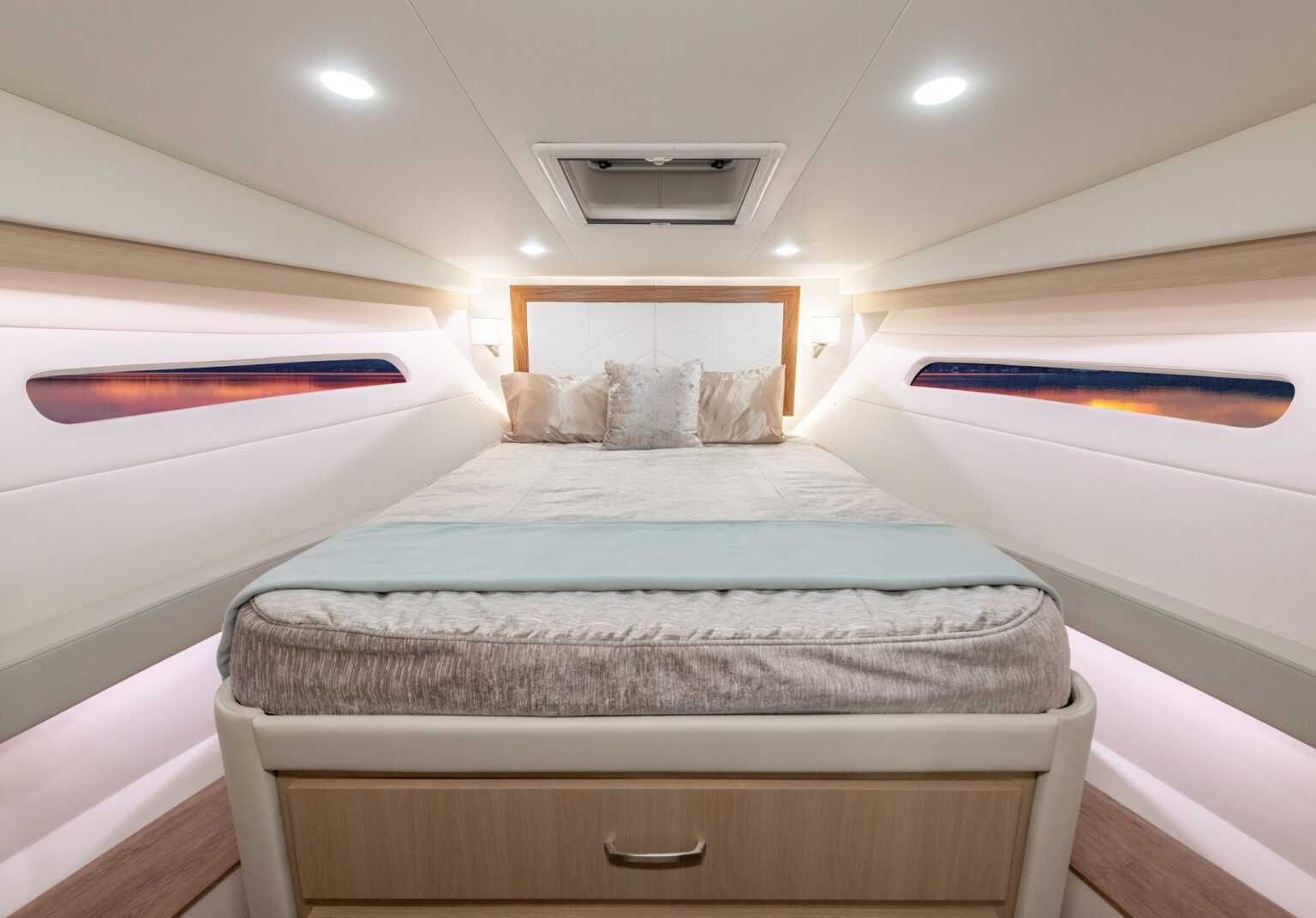 The 38 FXO features the most spacious forward stateroom in its class thanks to the centerline California Queen and walk-around space. The well-designed head on the 38 FXO is elegant and features a walk-in shower.