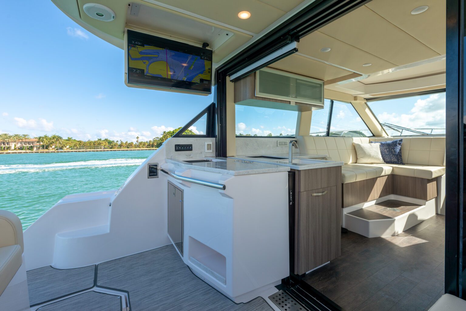 Lay back and enjoy the sunshine or sit up and watch the water on the multiposition foredeck sunpad. The optional cabana is perfect if you love the view but want some shade.
