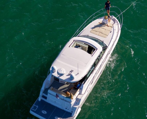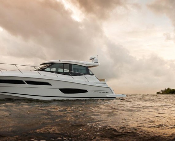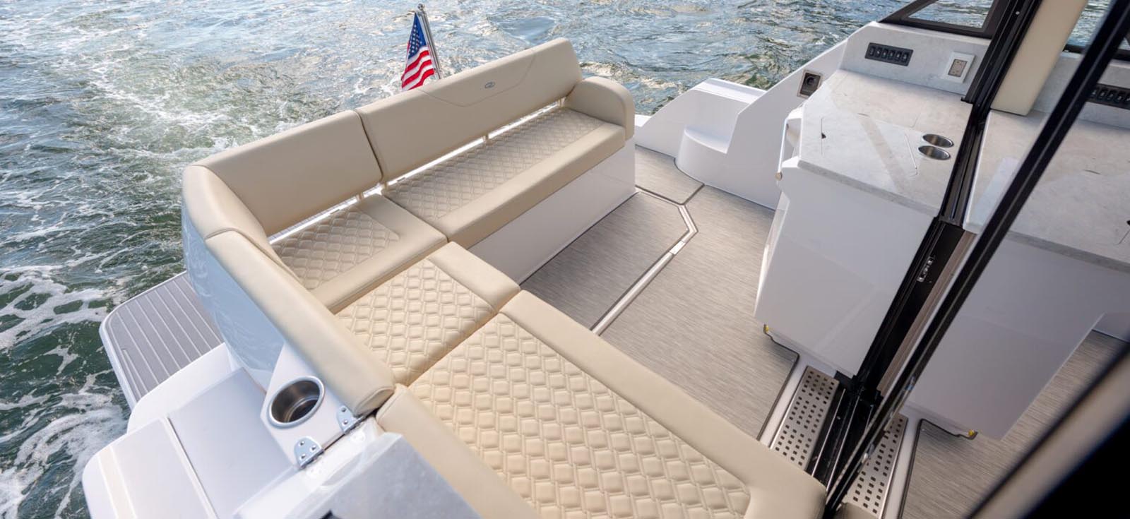 With storage under nearly every seat, in lockers, and even under the forward bed, you will always have a place for your gear. The 38 Grande Coupe features the most spacious forward stateroom in its class thanks to the centerline California Queen and walk-around space.