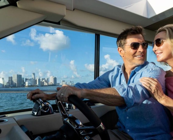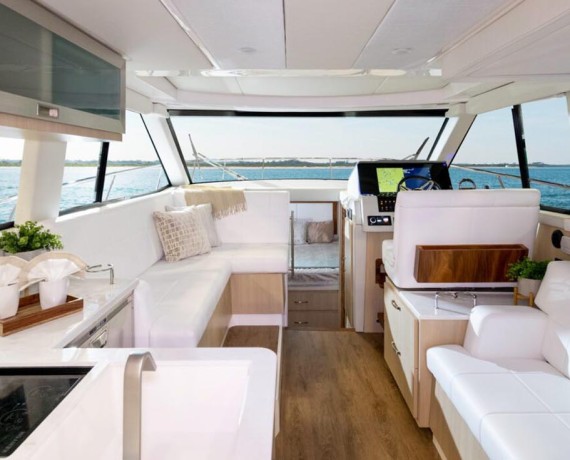 The 38 Grande Coupe was designed for clear views and natural light from the cabin to the upper salon. Thanks to large single-pane windows, the upper salon features 360° views, and with hull side windows, your cabin will be flowing with natural light.