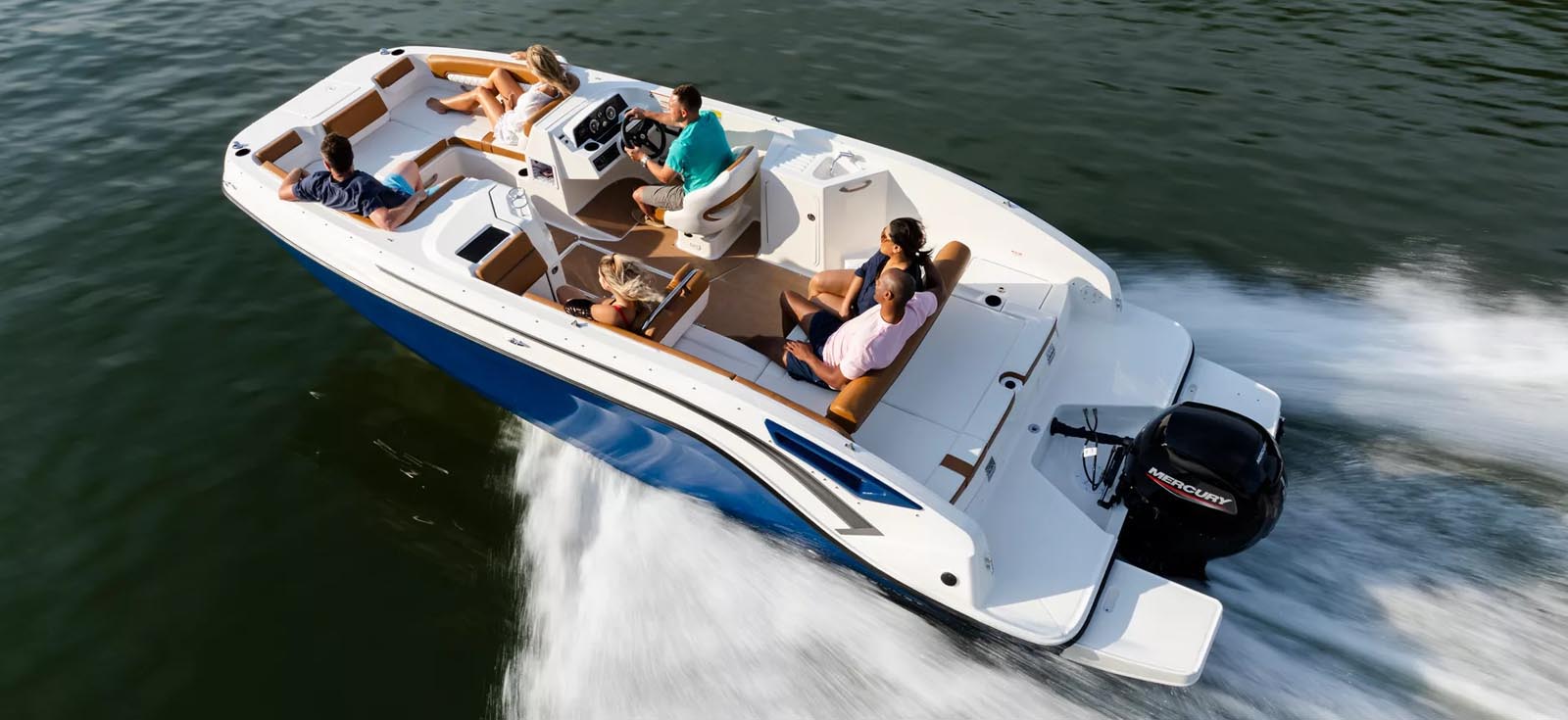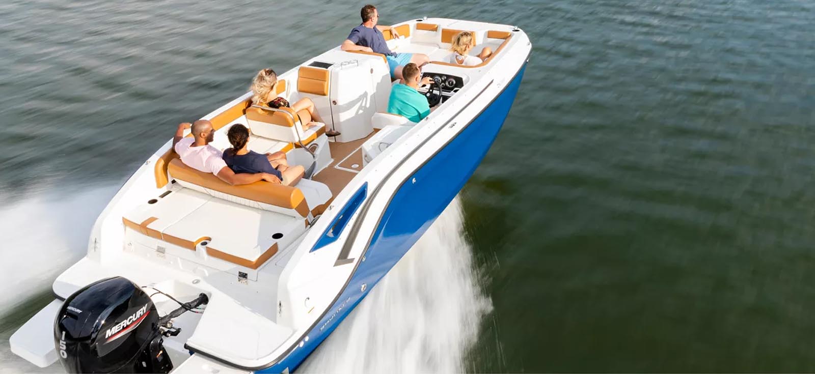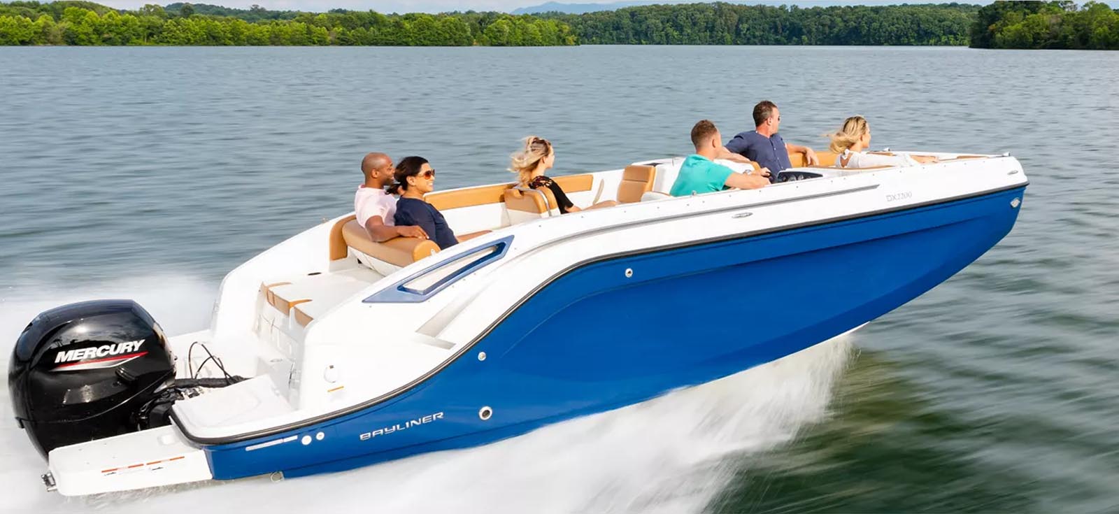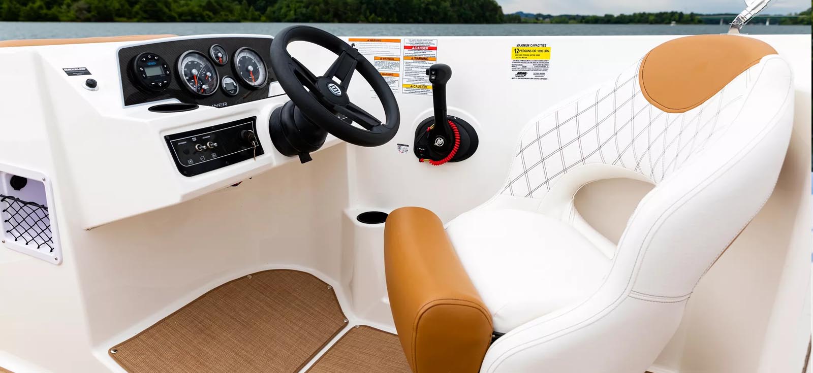 This family-friendly sterndrive model combines all the most popular aspects of the DX Series. The sleek exterior is complete with hull sculpting and stylish shear lines while the interior is loaded with all the comforts of home. The plush upholstery features quilting with black welt plus transitional cockpit and transom seating offer total lounging comfort while facing forward or aft. When underway the wider V-hull offers stability and a high freeboard keeps everyone safe and dry.