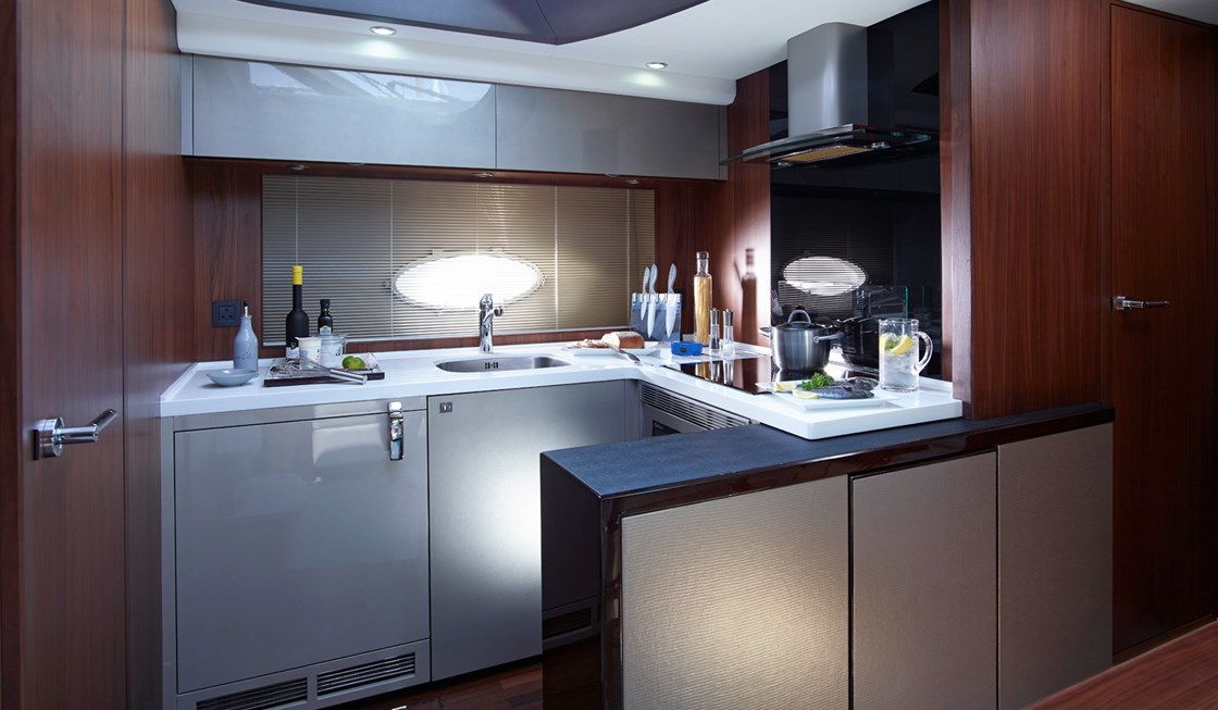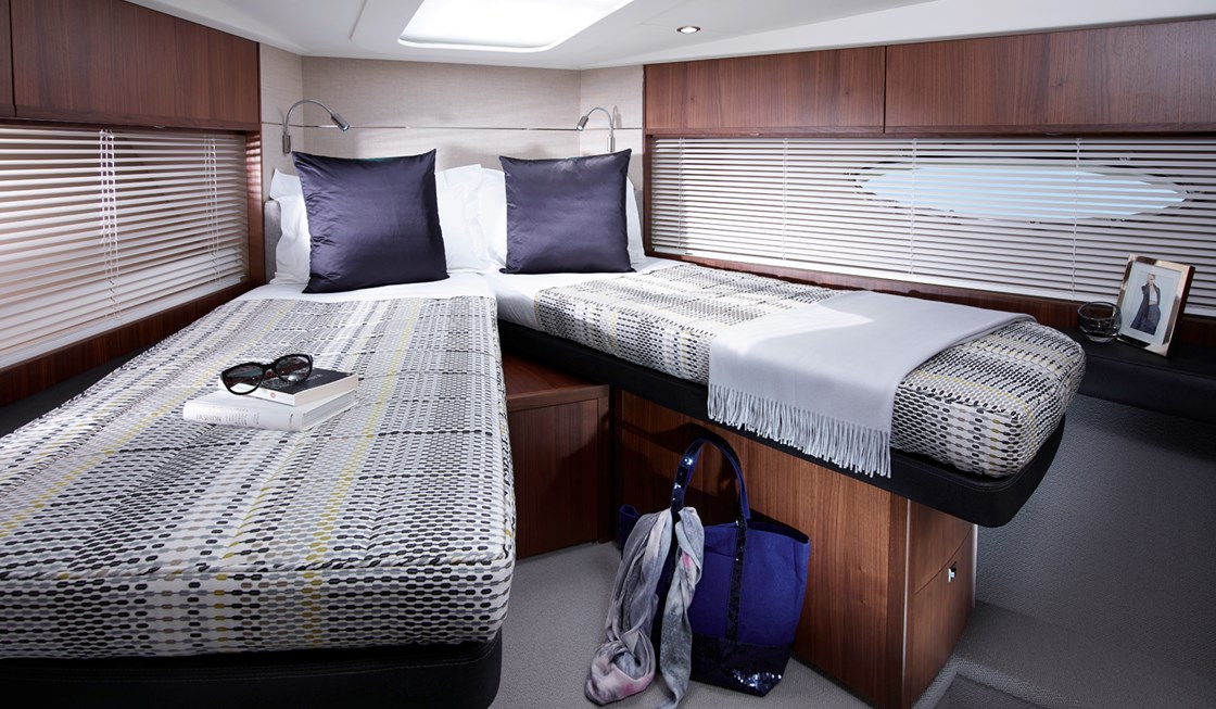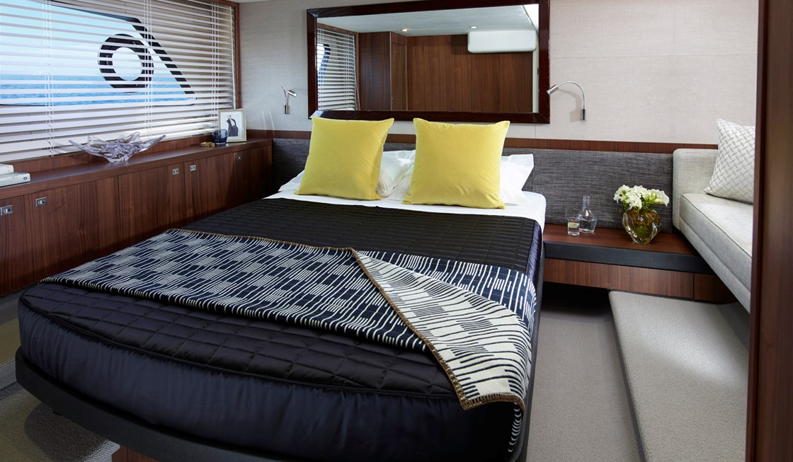 Function and refined form are in perfect harmony everywhere you look. Below deck, adjacent to the fully equipped galley, the lower saloon can either be a social entertaining area or cleverly converted into additional berths. The full-beam owner’s stateroom, with en suite bathroom and separate stall shower, is a luxuriously spacious haven. Guests are accommodated in the forward cabin which is fitted with scissor berths for added flexibility, there is also the option to specify a third guest cabin if required.