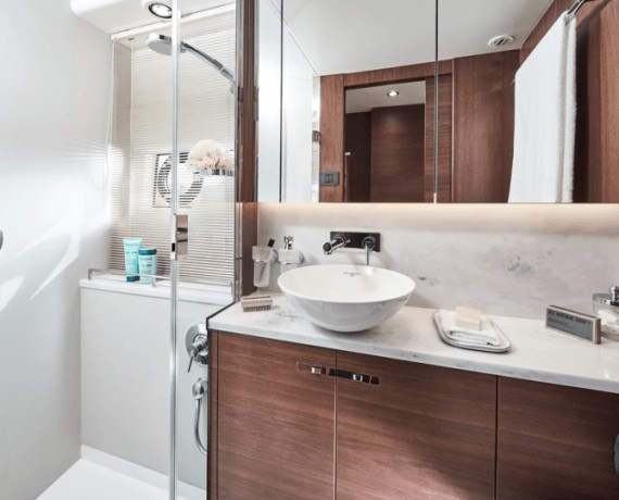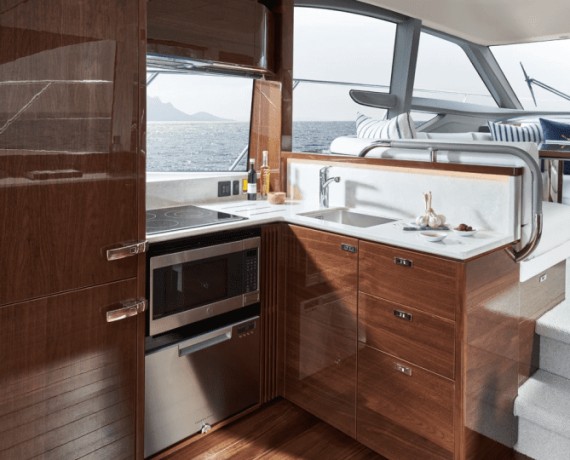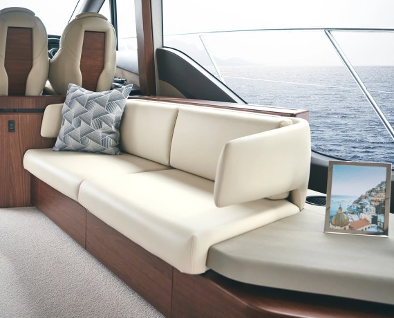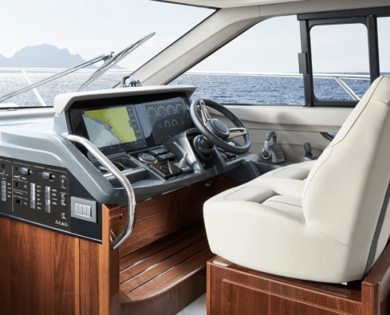 Featuring the latest F Class exterior styling, and advanced technology on-board, the F50 flybridge yacht delivers dynamic performance at sea. The flybridge features a spacious aft U-shaped seating area, forward L-shaped seating to port, which converts to a sunbed, and twin helm seats.