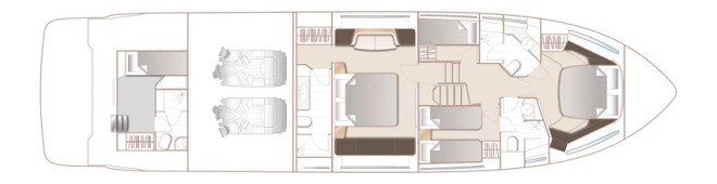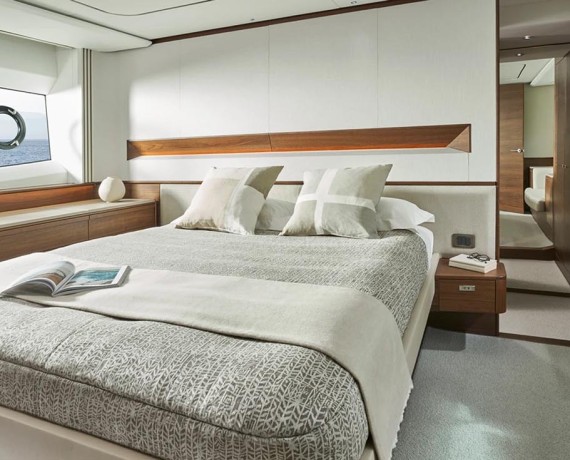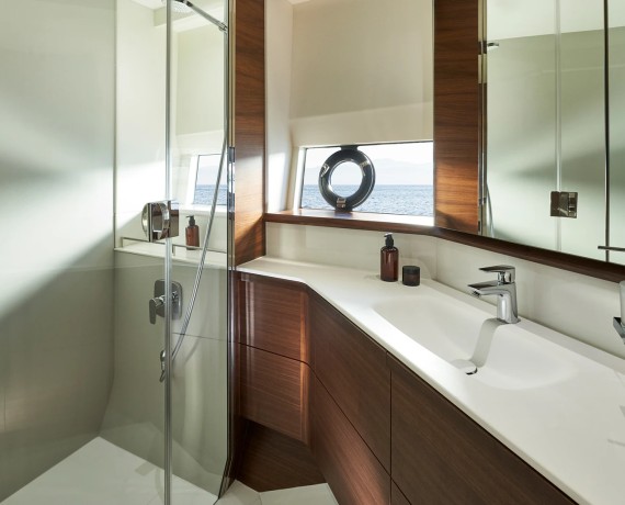 Focussed around a sociable use of space she provides accommodation for eight guests across four cabins. Vast panoramic saloon windows and signature wrap around front screens offer uninterrupted vistas from the main deck whilst elongated hull windows generously flood her accommodation areas with light.