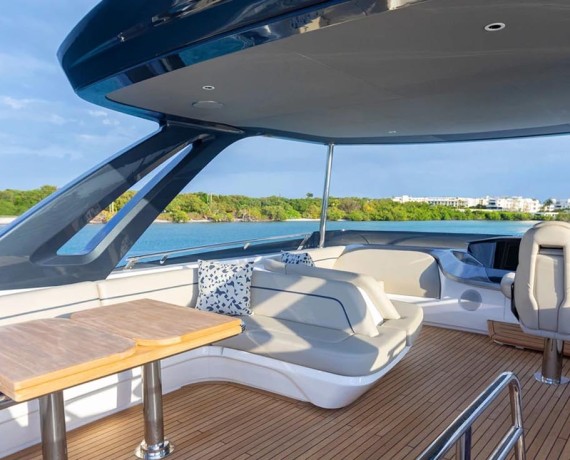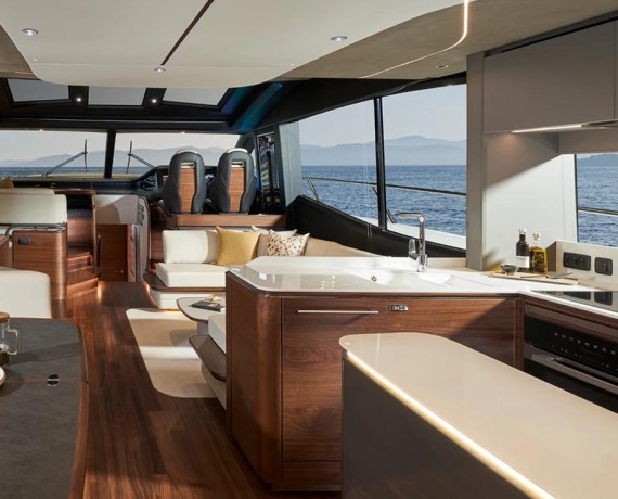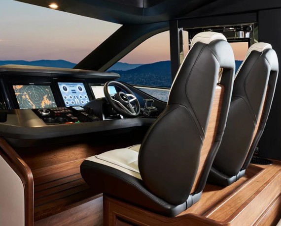 The cockpit features a unique sociable U-shaped seating area with modular seating, folding teak table and servery unit – the perfect place to entertain, or to sit back, relax, and enjoy the yacht’s exhilarating performance.