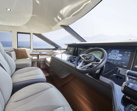The main deck offers an uninterrupted flow through from the cockpit to the helm featuring vast windows along the saloon to experience the surrounding panoramic views. For owner's who prefer a more private experience, optional partitions to the galley and wheelhouse are available.
