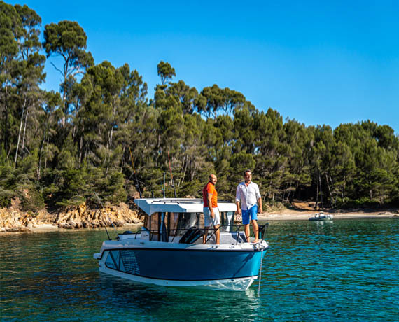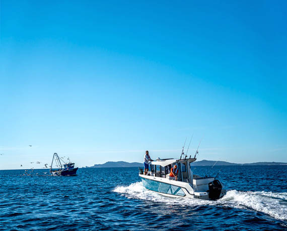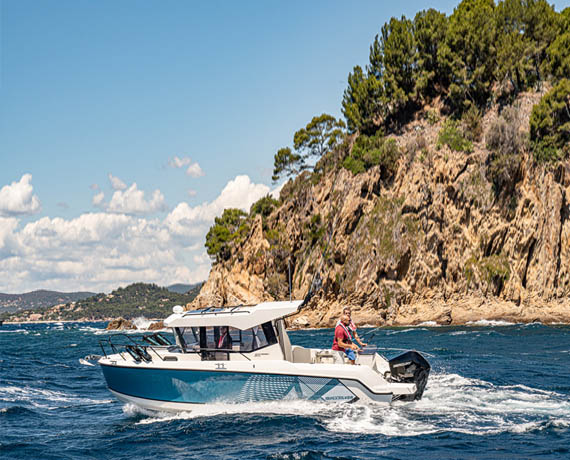 A new generation of Pilothouse models has arrived, tailored to the discerning angler. The curved hull portrays an aesthetically pleasing, sportier design. Centered around the sport you love, the 805 Pilothouse has features focused on a superior on-water experience such as an oxygenated fish locker to keep your bait fresh and your catch fresher. Reach your fishing spot faster with Mercury single and twin-engine options up to 350hp, and up to 9 people aboard. And for a premium experience, an Explorer version elevates your time on the water with more style and deluxe fishing features.