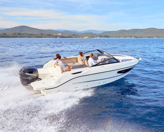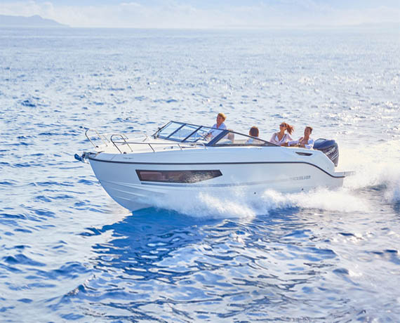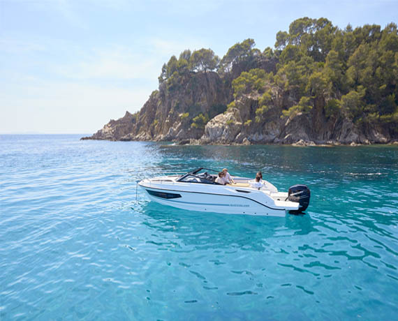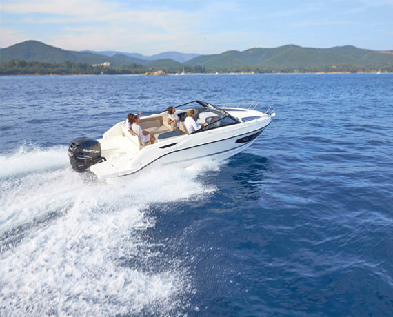 Break away for a day trip or a weekend on the water. The Activ 755 Cruiser’s deep cockpit and full windscreen keep you and your passengers safe and dry during the ride. Inside, the cabin’s wide windows offer the best views you’ll ever find in a 7-meter boat. Customisation is key. The cockpit area offers 3 configurations, several packs allow for significant upgrades of the boat’s accessories and there’s a whole range of Mercury engines available.
